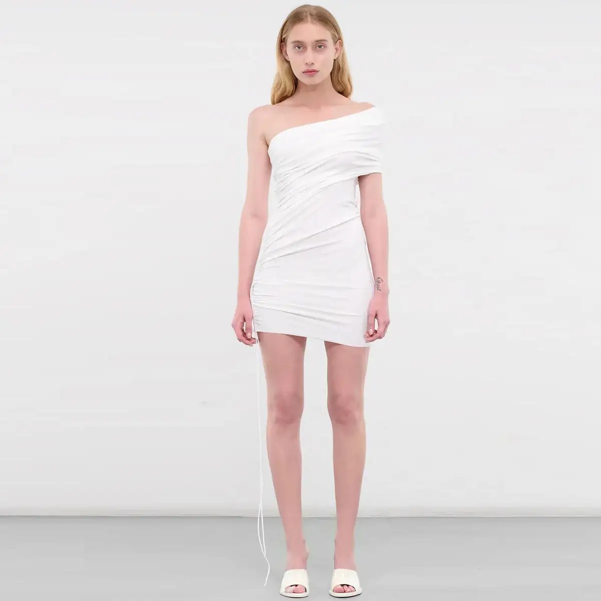 JY Z709DS Summer New Arrivals Womens Strapless Asymmetric Pleated Drawstring Dresses Mini Solid Color Ladies Fashion Dress